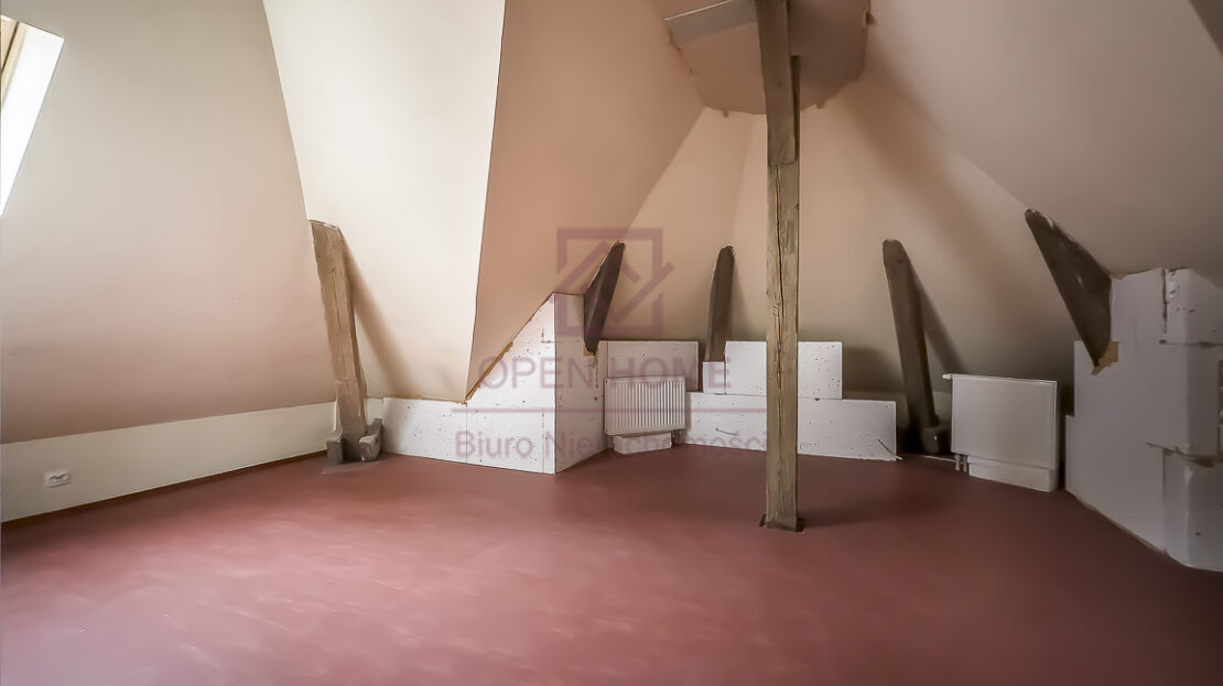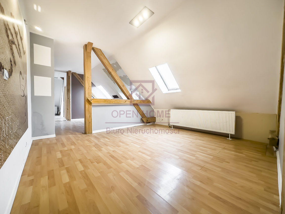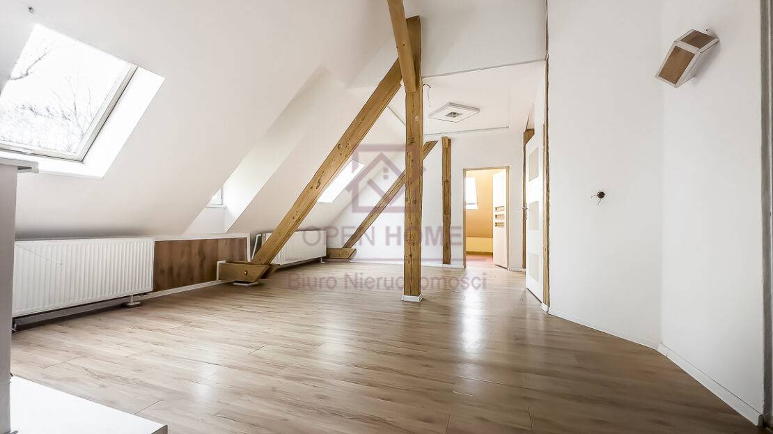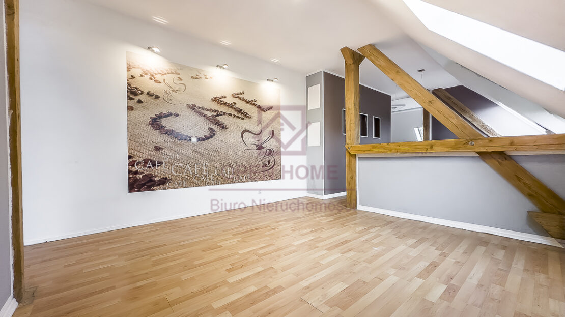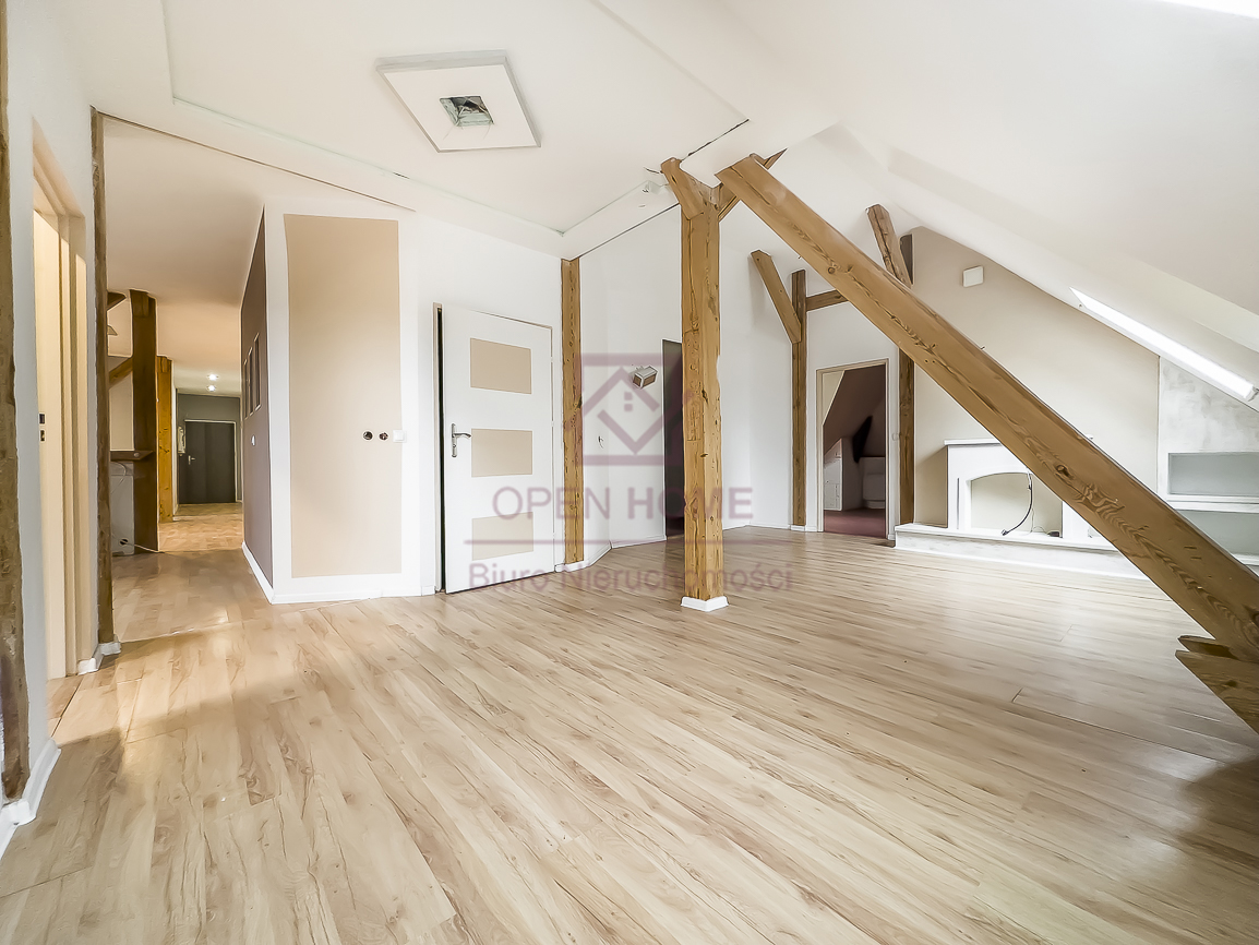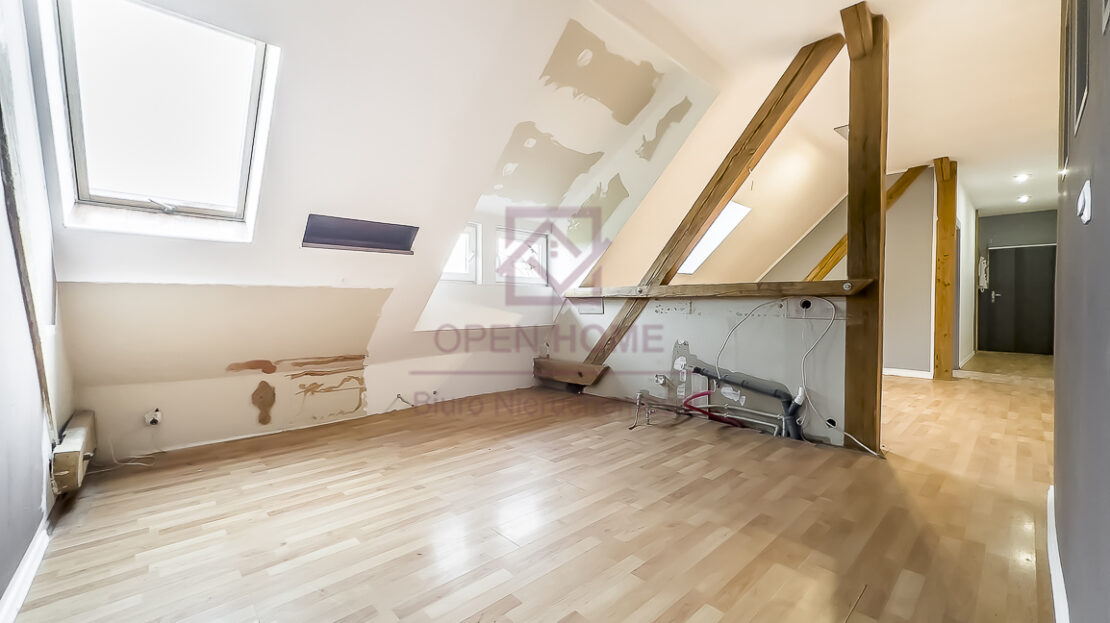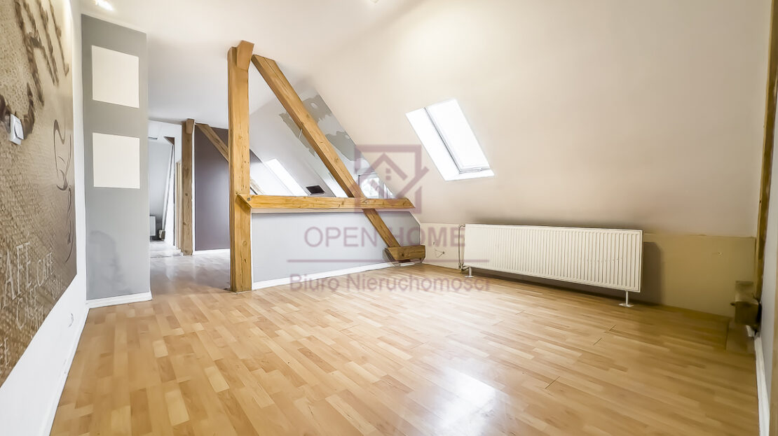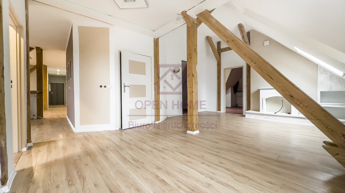 Mieszkanie jest niezwykle ustawne, jasne i daje poczucie dużej swobody aranżacyjnej. Powierzchnia użytkowa wynosi 101,41 m², natomiast powierzchnia „po podłodze” to 145,45 m², co sprawia, że wnętrze jest bardziej przestronne, a skosy i elementy konstrukcji dachu nadają mu wyjątkowego charakteru. Widoczne belki oraz oryginalne detale sprawiają, że lokal idealnie nadaje się do aranżacji w klimacie rustykalnym, przytulnym lub loftowym.